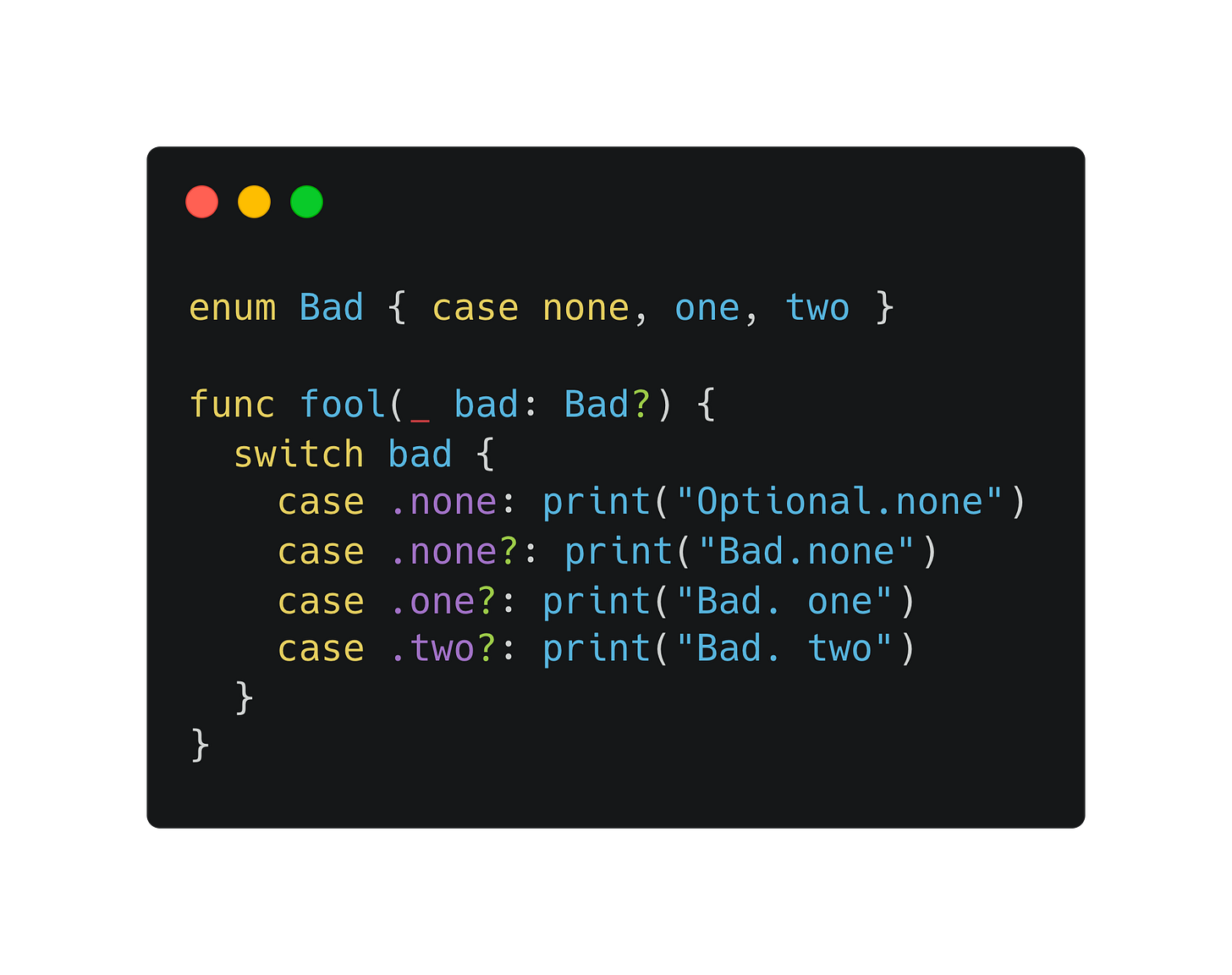 當把這 enum 放入 Optional ,在 switch 時便會遇到兩層的 .none